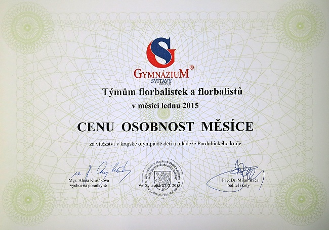 Florbalové týmy získali cenu Osobnost mÄ›síce (01-2015) - fotogalerie - Gymnázium Svitavy