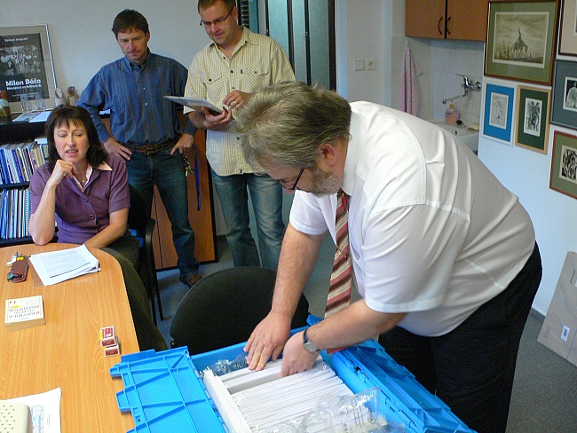Ředitel Å¡koly vyndává z pÅ™epravnÃho bezpeÄnostnÃho kontejneru testové úlohy.