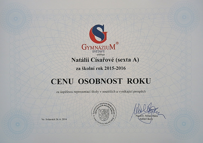 Å kolní cenu Osobnost roku získala N. CísaÅ™ová - fotogalerie - Gymnázium Svitavy