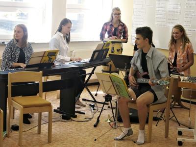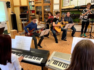 ZávÄ›reÄný koncert - dÄ›jiny hudby- TradiÄnà akcà na konci Å¡kolnÃho roku je vždy závÄ›reÄný koncert studentů hudebnà výchovy. Letos to byli hudebnÃci sexty, kteřà vystoupenà pojali jako procházku dÄ›jinami hudby (22. 6. 2017).